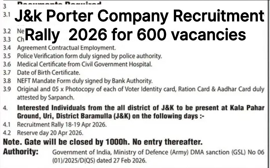 Porter Company Recruitment Rally 2026: Official Details The Government of India, Ministry of Defence (Army), has announced a major recruitment drive for 600 Porter positions. This rally is being conducted for the 275 Porter Company at Uri, District Baramulla, and is open to eligible candidates from all districts across Jammu and Kashmir. Important Schedule Rally … Read more