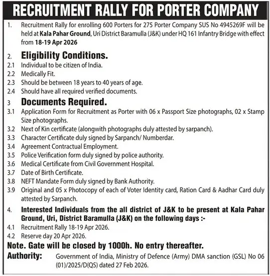 The Government of India, Ministry of Defence (Army), has announced a major recruitment drive for 600 Porter positions. This rally is being conducted for the 275 Porter Company at Uri, District Baramulla, and is open to eligible candidates from all districts across Jammu and Kashmir.